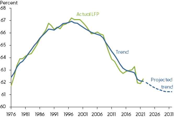 Labor force participation has also been declining since its peak in the late 1990s at around 68 percent and is now only at around 63 percent, a full percentage point lower than before the pandemic, but not terribly out of line with trends. This is an additional difference of around 16 million people.